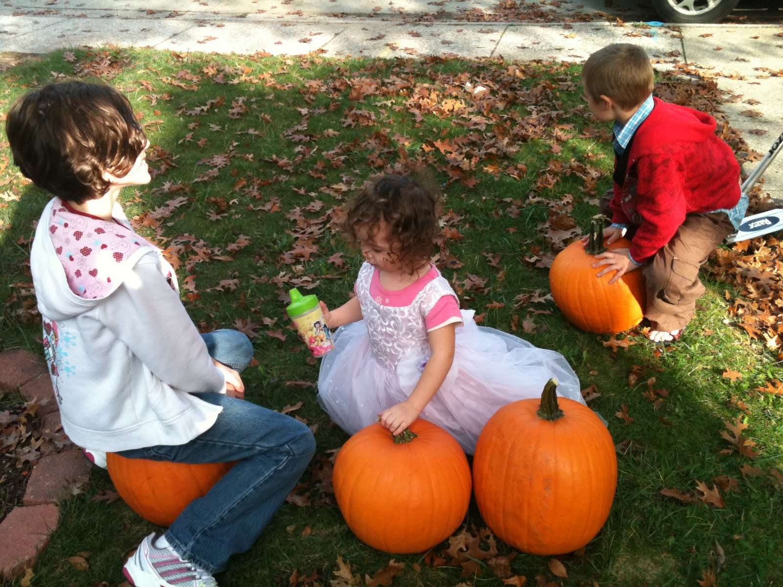 Our pumpkins. It makes me want to sing "5 Little Pumpkins" (I know I am missing a few!!), but I love that story!! The kiddos choosing their pumpkins. See Brady in her daytime royal attire??